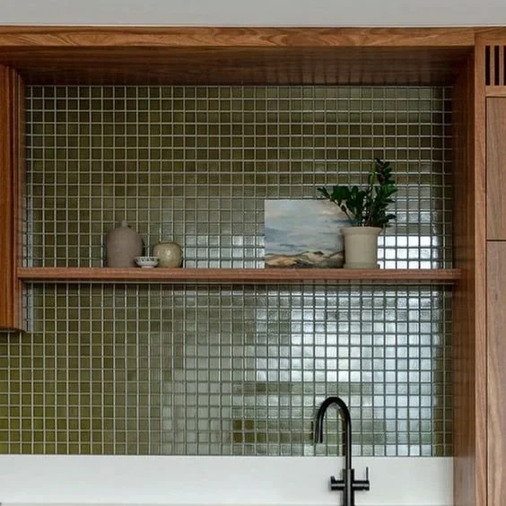 For example, a cobalt blue splashback in a kitchen with walnut cabinetry and white countertops can create a striking visual impact, making the space feel current yet classic. Similarly, vibrant green or blue floor tiles can complement the natural wood tones commonly found in mid-century kitchens, offering a lively and updated take on the traditional aesthetic.
