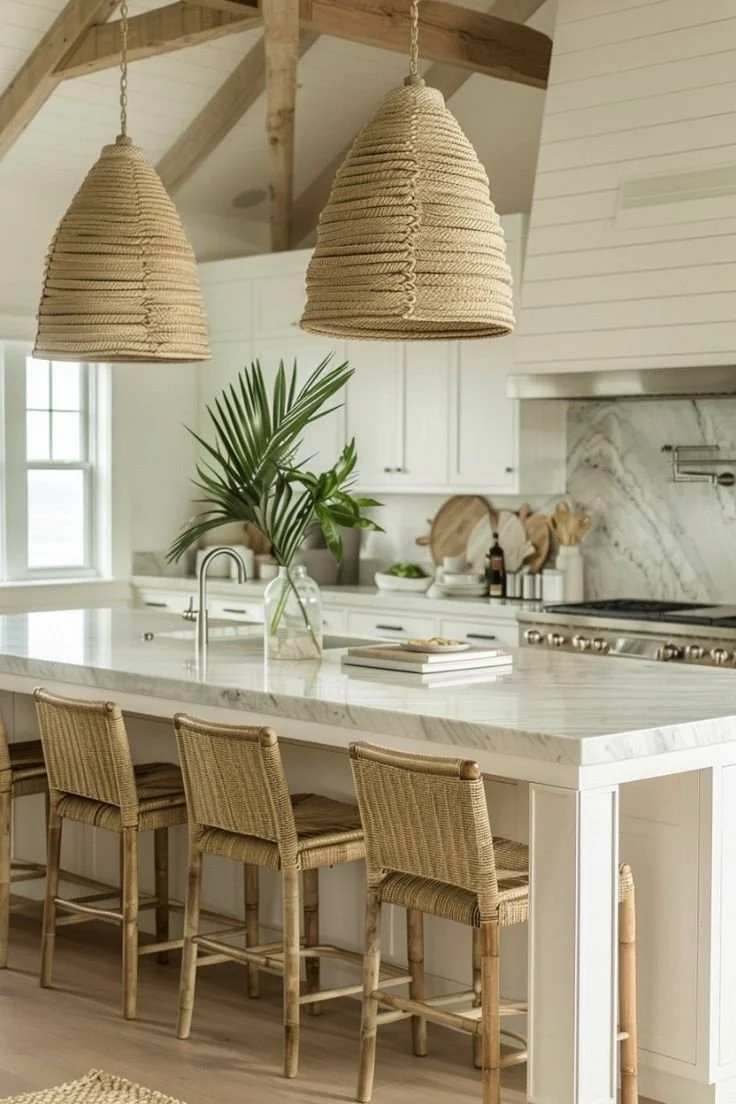 Woven baskets, glass jars filled with beach treasures, and marine-inspired artwork can all contribute to the beachy vibe. Keep the decor simple and uncluttered to maintain the serene, relaxed atmosphere of a coastal kitchen.