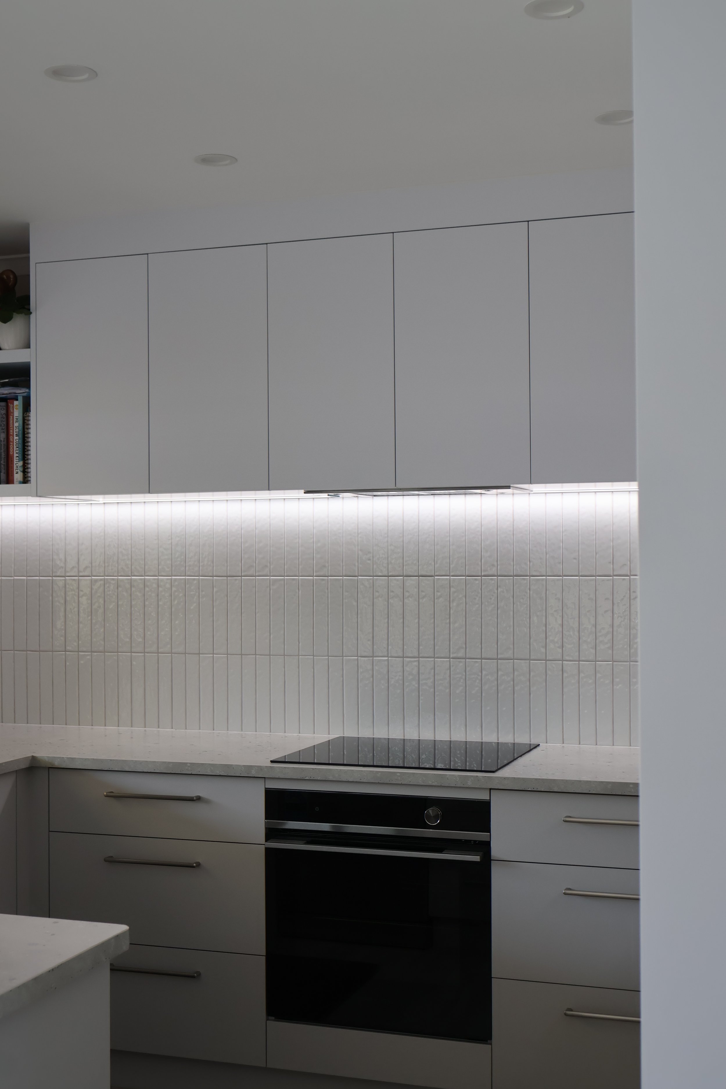 One benchtop, one splashback: Fewer finishes = calmer, “bigger” read.